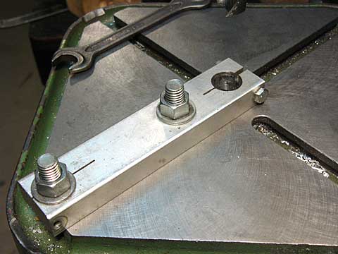 | 1. Drill two 1/2" holes in a piece of approx, 1-1/2" x 3/4"  aluminum bar. 2. Use these holes to bolt the bar to the drill press table, with one end over the hole in the center of the table.