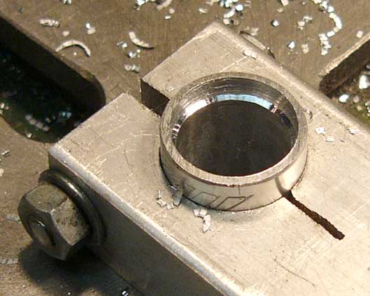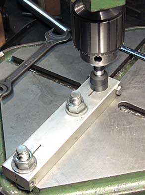 | 7. To accurately position the bar/fixture, run the 7/8" drill down past the flutes, then tighten the "T" bolts. BTW I'm too cheap to buy real "T" bolts. I just file flats on the heads of 1/2" carriage bolts.
